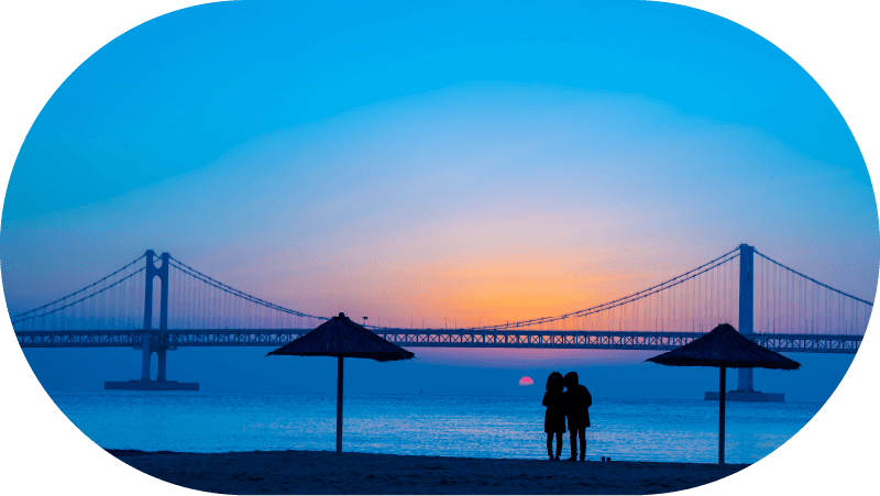 広安里ビーチでは美しい夜景を堪能できます。毎週土曜日にはドローンショーが開催されています。ぜひ港町釜山が誇る絶景をお楽しみください。